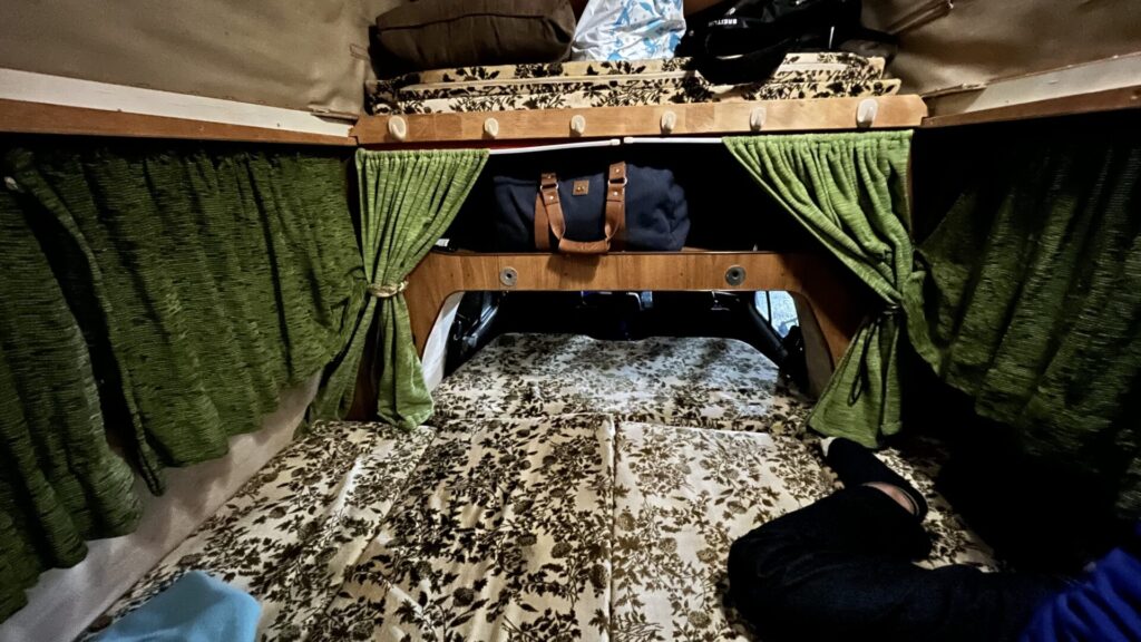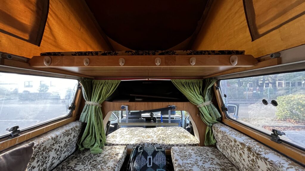ベース車は初代Golfのピックアップ版であるCaddyです。中にトラックが入ってるのです。デザイン上の特徴はベース車のボディに合わせて側面が丸く絞り込まれている点と、運転席のすぐ後ろからスムーズに一体化したキャンピングシェル。1980年代、ほとんど手作りで製造されたFRPボディは、40年を経ても非常にしっかりしていて割れや歪みもありません。一見、そのままでもすぐに旅に出られそうですが、室内は結構ヤれていて、特に壁や天井の内貼りは、いわゆる「加水分解」でスポンジがボロボロになってひどい破れ方。そして、冷蔵庫やヒーターがプロパンガス仕様になっているのですが、今の時代、個人でプロパンガスを充填してもらうのはとても難易度が高く、どこでも充填できるわけではないので、システムの入れ替えを決意。さらには、クッションのカバーやカーテンなども相当時代がかっているので、気持ち良い空間にすべくリノベーションを始めます。